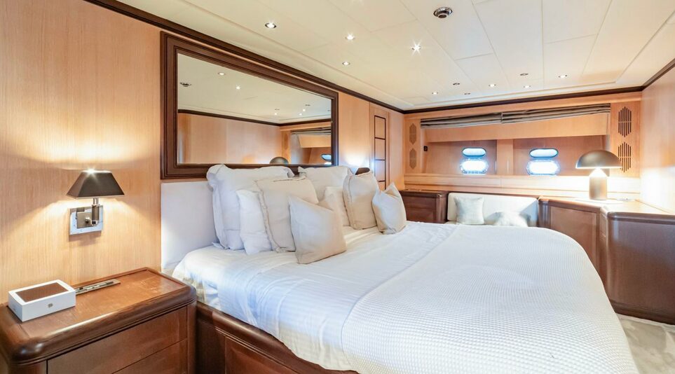 The Mangusta 108 is a 33-meter Italian performance yacht (2004) that represents the flagship of Mangusta’s Maxi Open range. Powered by twin MTU 12V 4000 M90 engines delivering 2,750 HP each with KaMeWa waterjet propulsion, she reaches an exhilarating top speed of 37 knots with a cruising speed of 30 knots. Accommodating up to 12 guests by day and 8 by night across 4 en-suite cabins (1 master, 2 doubles, 1 twin), the 108 combines aggressive performance with spacious open-style living. Her award-winning design features extensive sunpads forward and aft, retractable hardtop in the main salon, and a GRP planing hull engineered for both speed and stability offshore. With crew quarters for 5 and a 350-nautical-mile range, the Mangusta 108 delivers the ultimate fast cruising experience for those who refuse to compromise between adrenaline and luxury—perfect for Mediterranean island-hopping and coastal runs where arrival time matters as much as the journey itself.